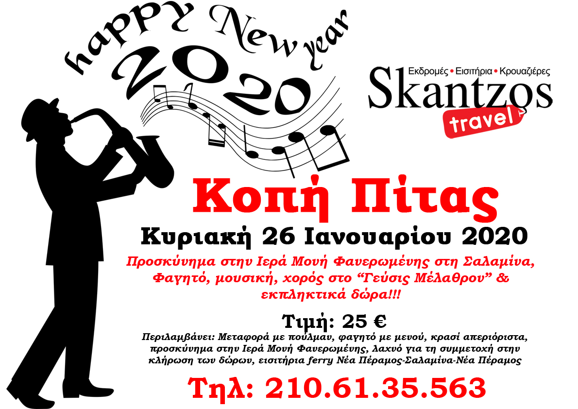 Αναχώρηση το πρωί (10.00-10.30) με προορισμό μας την Νέα Πέραμο, όπου θα επιβιβαστούμε στο καραβάκι και μετά από σύντομη διαδρομή θα φτάσουμε στην όμορφη Σαλαμίνα. Πρώτος μας σταθμός η ιστορική Ιερά Μονή Φανερωμένης. Η μονή ιδρύθηκε το 1670 από τον Λάμπρο Κανέλλο από τα Μέγαρα, μετέπειτα Όσιο Λαυρέντιο, που σύμφωνα με την παράδοση βρήκε την εικόνα της Παναγίας και ανακαίνισε τον ναό που υπήρχε στη θέση αυτή αιώνες πριν. Είναι αφιερωμένη στην Κοίμηση της Θεοτόκου και εορτάζει στις 23 Αυγούστου, περιβάλλεται δε από συγκροτήματα κτιρίων που της προσδίδουν τη μορφή φρουρίου. Παραμονή για προσκύνημα και αμέσως μετά συνεχίζουμε για το πολυχώρο εκδηλώσεων «Γεύσις Μέλαθρον», όπου θα γίνει η κοπή της πίτας του γραφείου μας για το 2020. Η ημέρα θα περιλαμβάνει φαγητό, μουσική, χορό, πλούσια δώρα και πολύ πολύ κέφι για να γιορτάσουμε μαζί τον ερχομό της καινούριας χρονιάς και να σας ευχαριστήσουμε για την προτίμηση, την εμπιστοσύνη και την στήριξή σας. Αναχώρηση αργά το απόγευμα για την επιστροφή μας στο Μαρούσι.